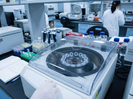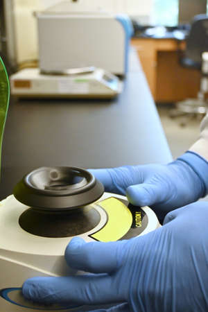 A technician in a lab is analyzing a sample with a centrifuge while wearing protective gloves. The workspace is bright and organized.