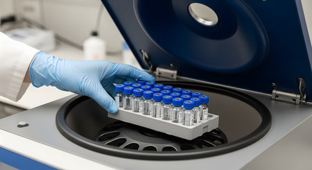 A scientist's hand, wearing a blue nitrile glove, places a rack of small glass vials into a laboratory centrifuge. This scene represents scientific research, medical testing, pharmaceutical development, and the process of separating samples.