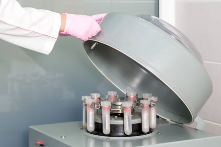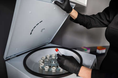 Laboratory worker puts chemical tubes into the centrifuge. Biochemistry and research laboratory concept. DNA and pharmaceutical analysis.