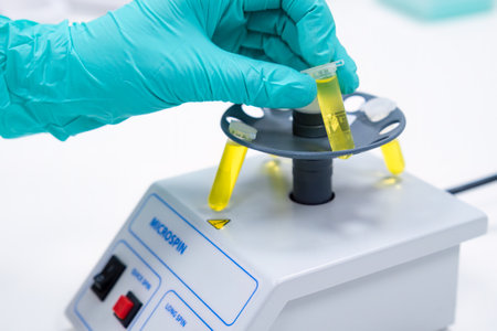 Closeup of a scientist hand placing a tube into a small table centrifuge. Spin column-based nucleic acid purification technique.