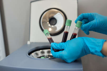 Platelet-Rich plasma preparation. Tube with blood in hands. Centrifuge. Background.