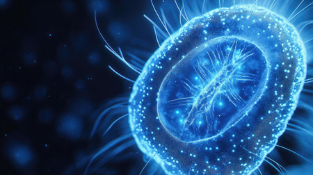 Close-up of a single biological cell with glowing edges and complex internal structures on a dark background. Copy space.