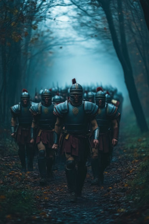 Roman Legionaries Advancing Through Foggy Forest at Night