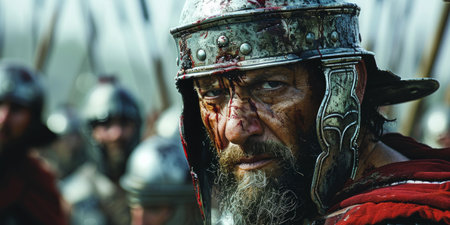 A bearded man in a helmet stands before Roman soldiers in a powerful image