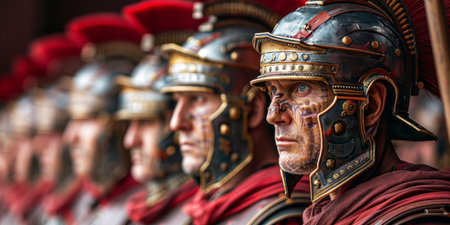 A row of Roman soldiers stands tall, wearing helmets and ready for battle.