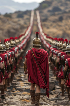 Roman centurion in lorica armor reviewing legion's formation before battle