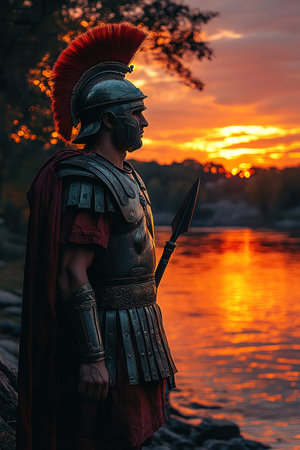 Roman soldier standing by the river at sunrise, spear and shield ready, epic atmosphere