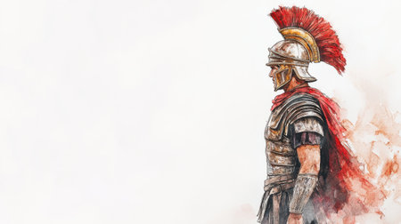 The Roman soldier stands with a strong posture, showcasing his armor and helmet adorned with a red plume, embodying the might of ancient Rome.