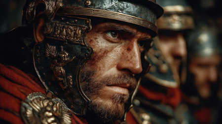 Photorealistic depiction of Roman soldiers adorned in armor. Biblical figure. Historical figure.