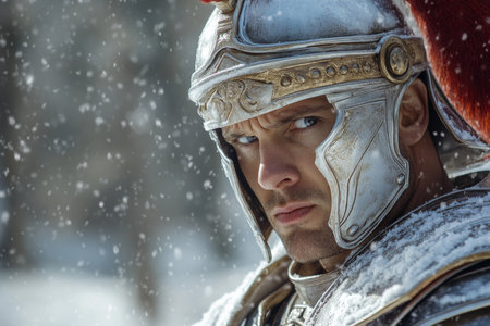 A photorealistic portrait of a Roman soldier in full armor, standing solemnly in a snowy landscape. The cold wind blows snowflakes across his face, and the metallic shine of his armor contrasts against the soft white of the snow, evoking a sense of history and duty.