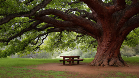 An impressive tree with sprawling branches offers a serene setting, providing shade over a rustic picnic table, perfect for outdoor gatherings in a lush green landscape.