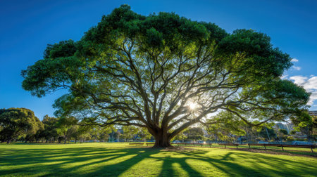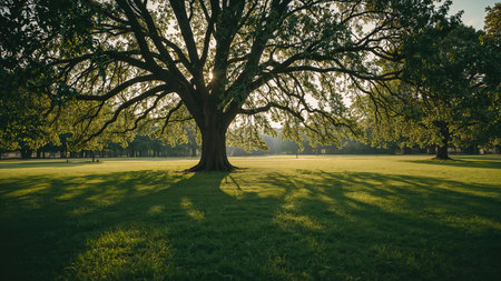 A stunning view of a majestic tree standing tall in a lush green park, with sunlight streaming through its leaves, creating a serene atmosphere.