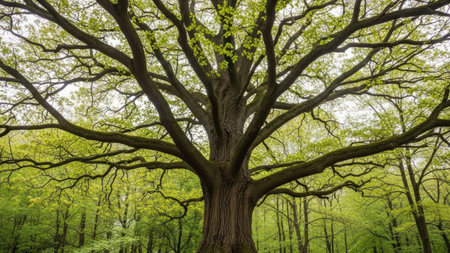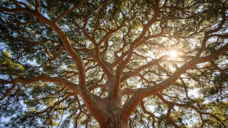 A striking perspective of a large tree captured from its base, showcasing the extensive network of branches and vibrant green leaves. The upward view reveals the tree's height against the sky, illuminated by sunlight. This image is suitable for various commercial uses, including environmental themes and nature-related content.