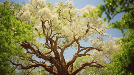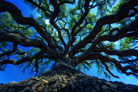 A striking image of an ancient tree with sprawling, twisted branches set against a vibrant clear blue sky. the intricate patterns of the tree's bark and the lush green foliage create a captivating contrast and evoke a sense of wonder and natural beauty. Generative AI
