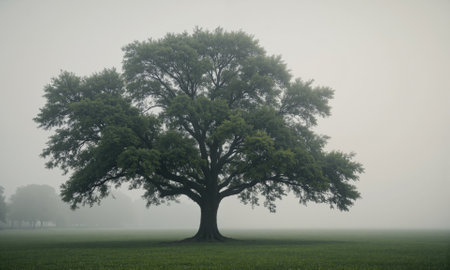 AI Generated. Majestic tree standing in a tranquil forest at dawn