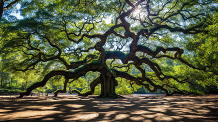 Enchanting Oak Majesty: Sunlight Filtering Through Ancient Tree Canopy