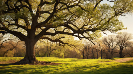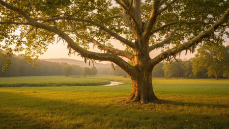 A majestic oak tree stands proudly with expansive branches, bathed in golden sunlight, creating a serene and inviting atmosphere in the natural landscape.