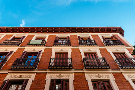 Apartment building exterior with red bricks wall and window railings in San Francisco, California
