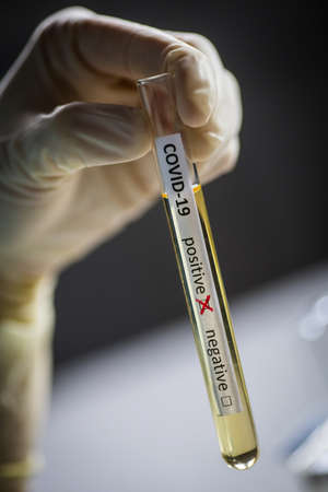 Doctor hand in rubber medical glove holding a test tube with Covid-19 test label.