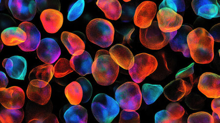 A mesmerizing microscopic view of colorful cells and particles illuminated against a dark backdrop, offering a stunning display of vibrant patterns and structures for scientific exploration.