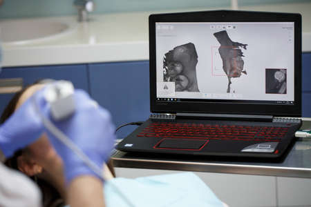 Stock photo of unrecognized dentist using x-ray machine with patient.