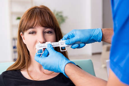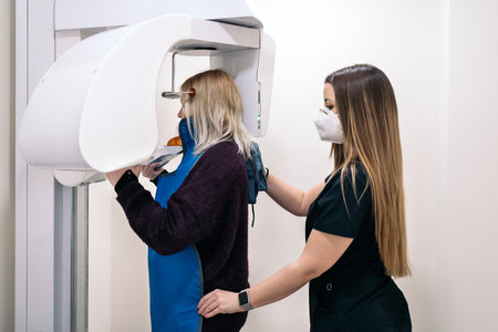 Female dentist helping unrecognized patient to use x-ray machine used in dental clinic.