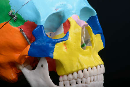 Three quarters view of coloured plastic educational model of a human skull on black background.