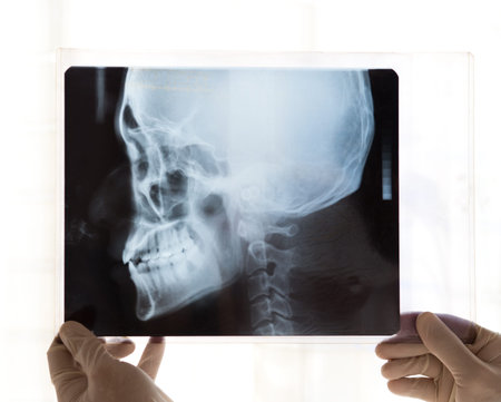 Survey radiography of a man’s skull on the side. A doctor radiologist is studying an x-ray examination. A snapshot of the skull is placed on the patient’s head.