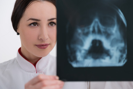 X-ray of the skull in the hand of a female doctor. With copy space. Diagnosis of sinusitis