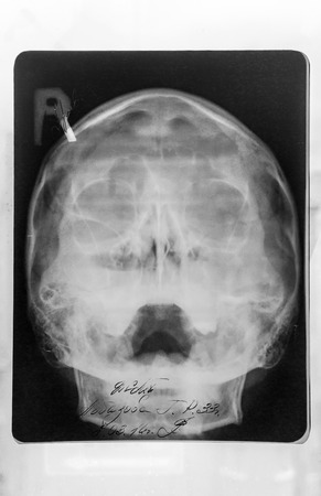 Survey radiography of the skull of a man. A doctor radiologist is studying an x-ray examination. A snapshot of the skull is placed on the patient’s head.