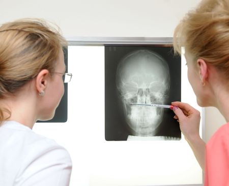 Doctor looking at X-ray of skull. Close up. Concept of medical cosultation.