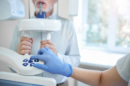 Cropped photo of a dentist regulating switchboard of a panormaic x-ray machine