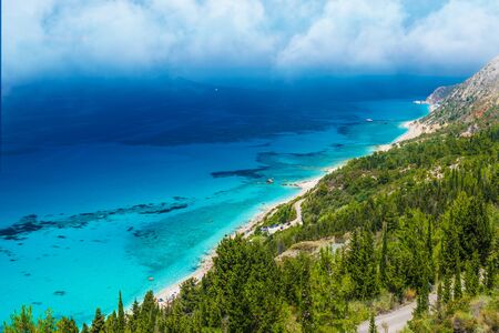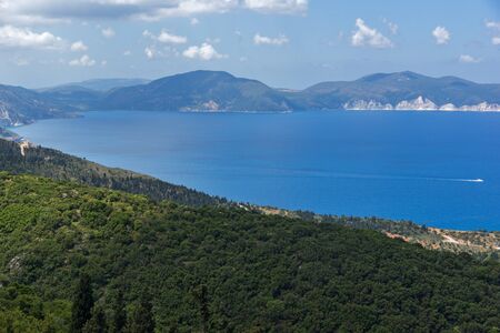 Panoramic view of amazing coastline on Kefalonia Island. Picturesque landscape, colorful Ionian sea, white clouds floating over mountains. Greece