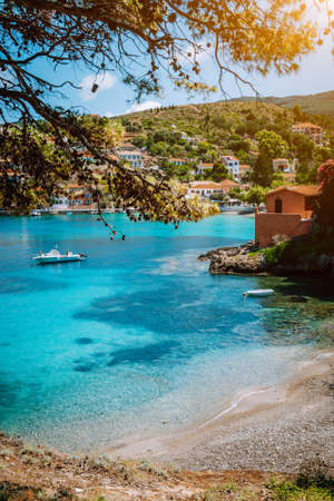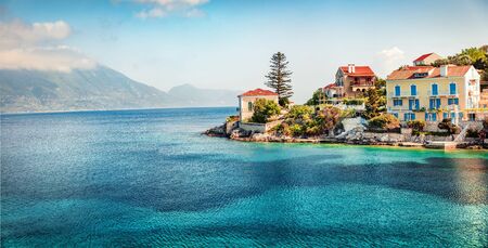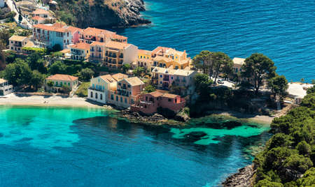Amazing coastline with colorful houses under sunlight. Wonderful summer seascape with perfect blue sky of Ionian Sea. Assos village. Kefalonia island. Greece
