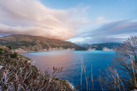 Kefalonia coastline, with rocky coast and dramatic sky on sunset. Greece vacation trip.