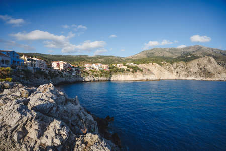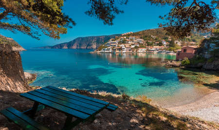 Panoramic spring seascape of Ionian Sea. Wonderful Sunny Day. Beautiful view over the sea beach in Assos village with colorful houses. Kefalonia island. Greece
