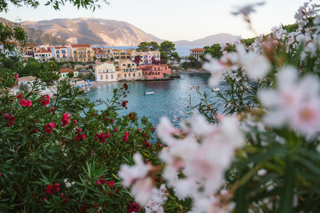 Red blossom oleandre flower of Assos village with colorful traditional houses on Kefalonia Island, Greece