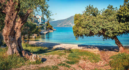 Sunny summer view of Zavalata Beach in Fiskardo town. Attractive morning seascape of Ionian Sea. Calm outdoor scene of Kefalonia island, Greece, Europe. Traveling concept background.