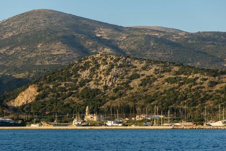 View of the city from the sea, moored yachts, reflection in the water. Greece, the island of Kafelonia.