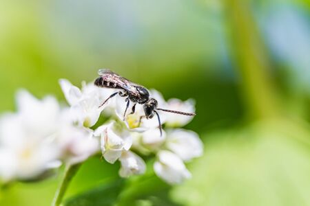 A small bee on a flower, a bee sucking on a nectar on a flower
