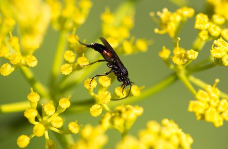 Closeup on a green blue eyed square headed wasp,Holotachysphex , from the Mediterranean region in southern France