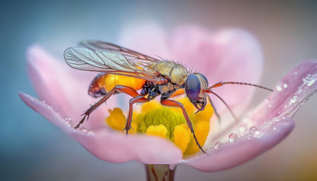 Close-Up of Striking Winged Insects on Vibrant Flower Blooms with Tiny Dew Drops Sparkling
