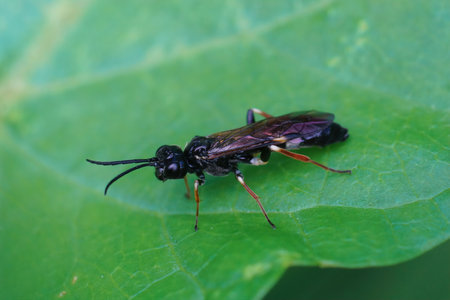 Closeup of the curled or banded rose sawfly, Allantus cinctus on a green leaf in the garden