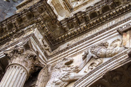 Benevento, Campania, Italy: the Roman Arco di Traiano, historic monument with sculptures, at morning