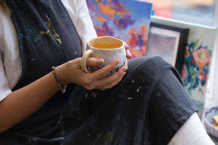 Artist Woman in dirty apron resting with a cup of tea sitting on the windowsill and looks out the window