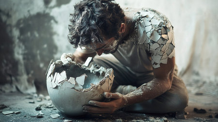 Man kneeling with cracked ceramic shell in hands, symbolic pose, textured background, artistic and conceptual visual style