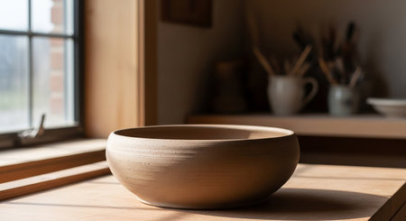 showing handmade ceramic bowl on wooden surface near window with sunlight and studio background. resolution
