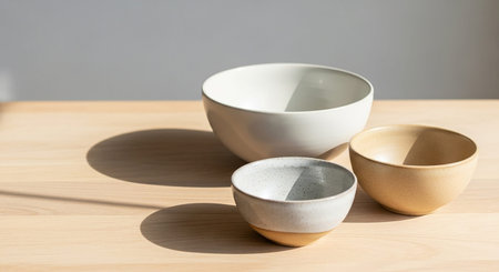Three ceramic bowls of varying sizes and colors sit on a wooden table with sunlight.