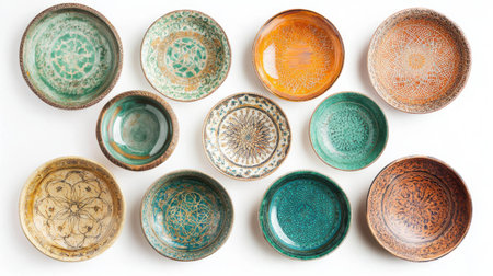 Colorful bowls arranged on white surface with beautifully detailed circular pattern design