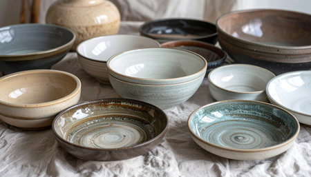 A beautiful collection of handmade ceramic bowls and plates sits on a linen cloth, each piece unique with its own rustic charm and earthy glaze.